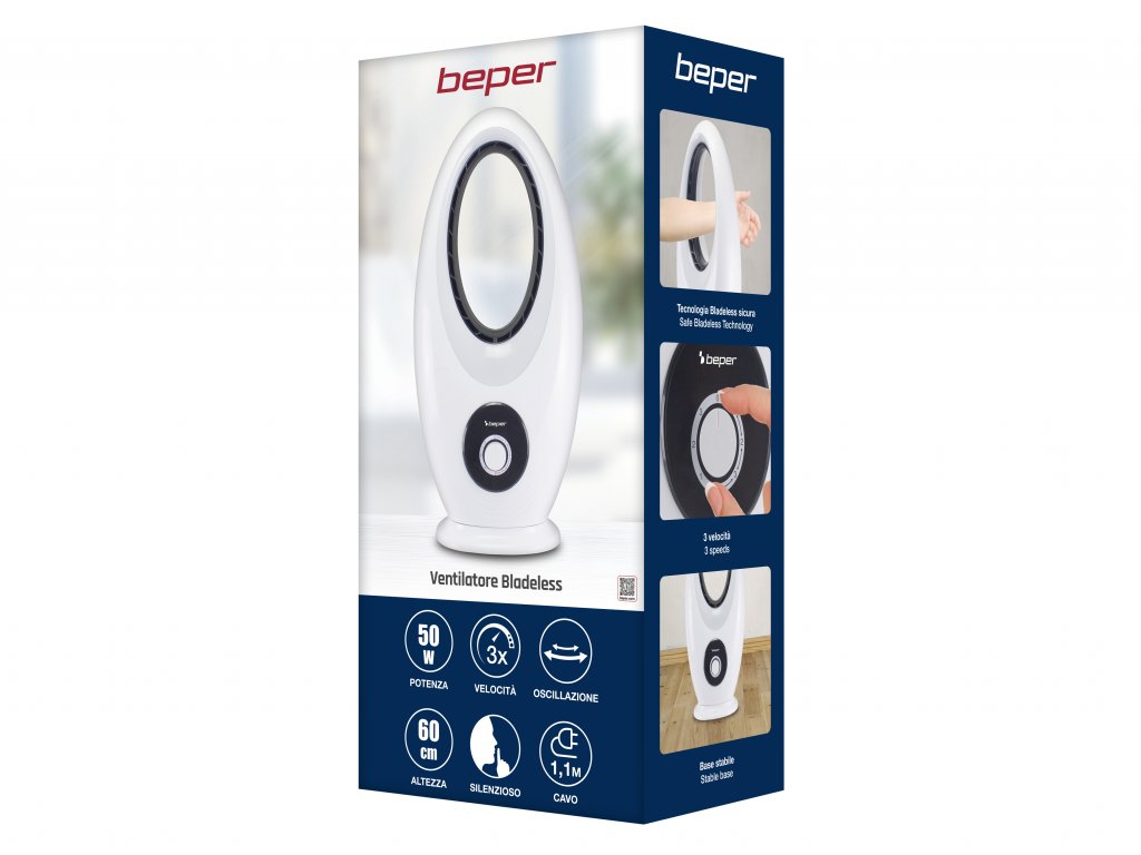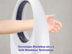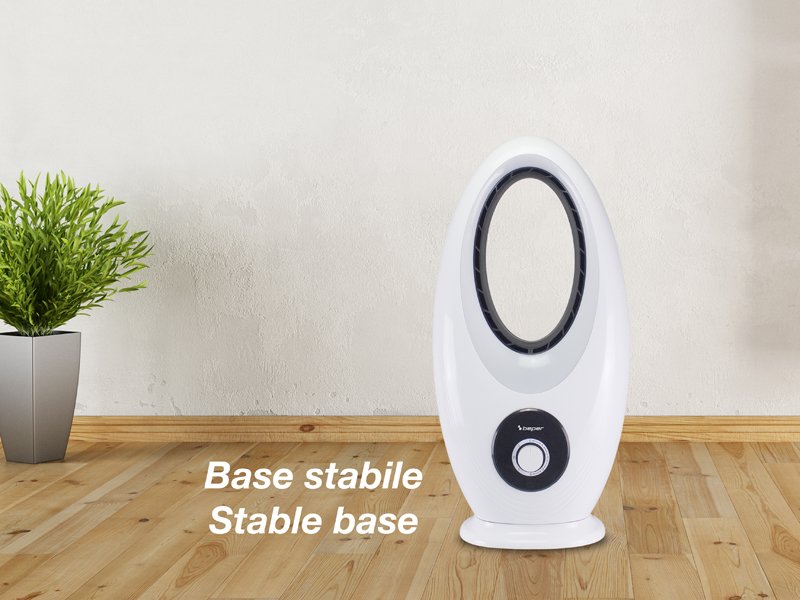 Modernaus dizaino grindų ventiliatorius, sukurtas naudojant novatorišką technologiją be menčių, kad oro srautas būtų geriau ir efektyviau paskirstytas visame kambaryje.