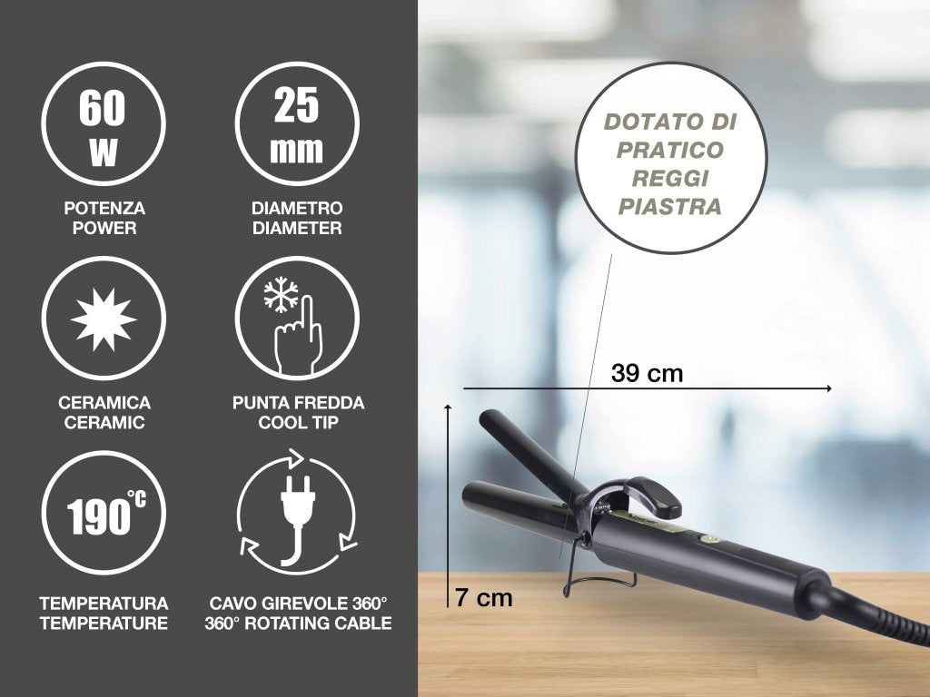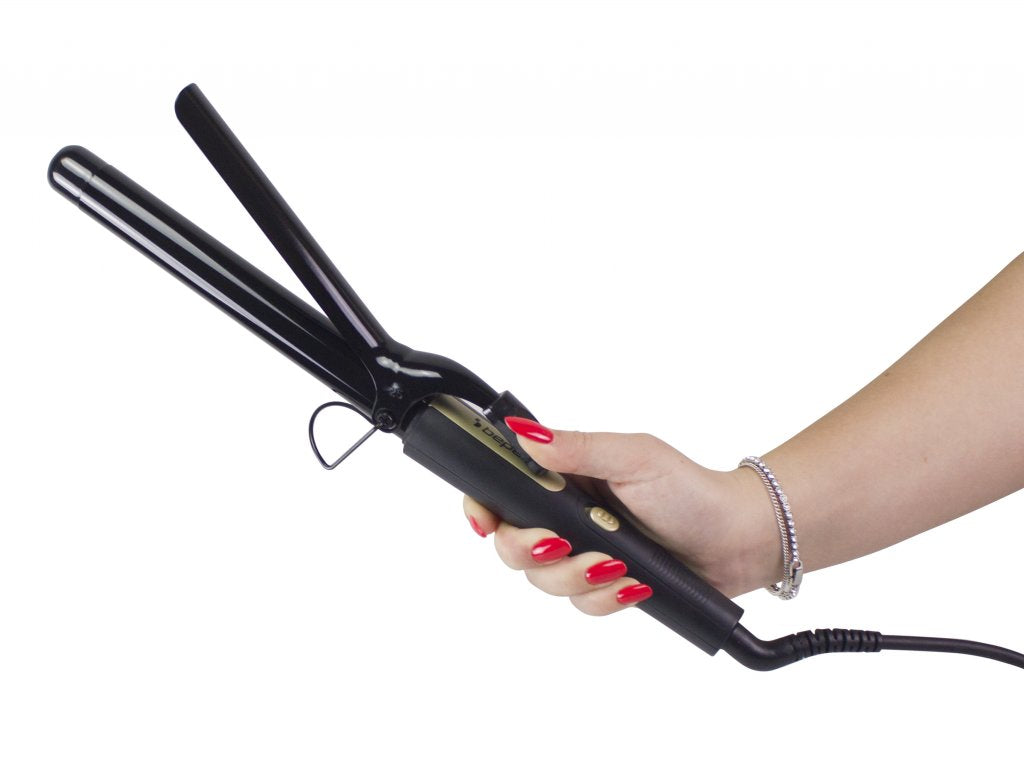 Modernaus dizaino garbanojimo žnyplės, idealiai tinkančios greitai suformuoti ryškias garbanas: dėl PTC kaitinimo elementų maksimali temperatūra pasiekiama iki 190 °C, o keraminė danga apsaugo plaukus ir suteikia jiems blizgesio.