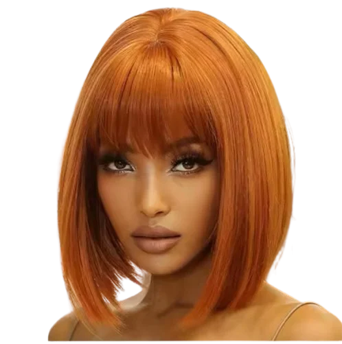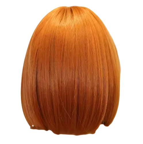 Aukštos kokybės sintetinių plaukų perukas su ryškia vario oranžine spalva ir stilingu bob kirpimu.