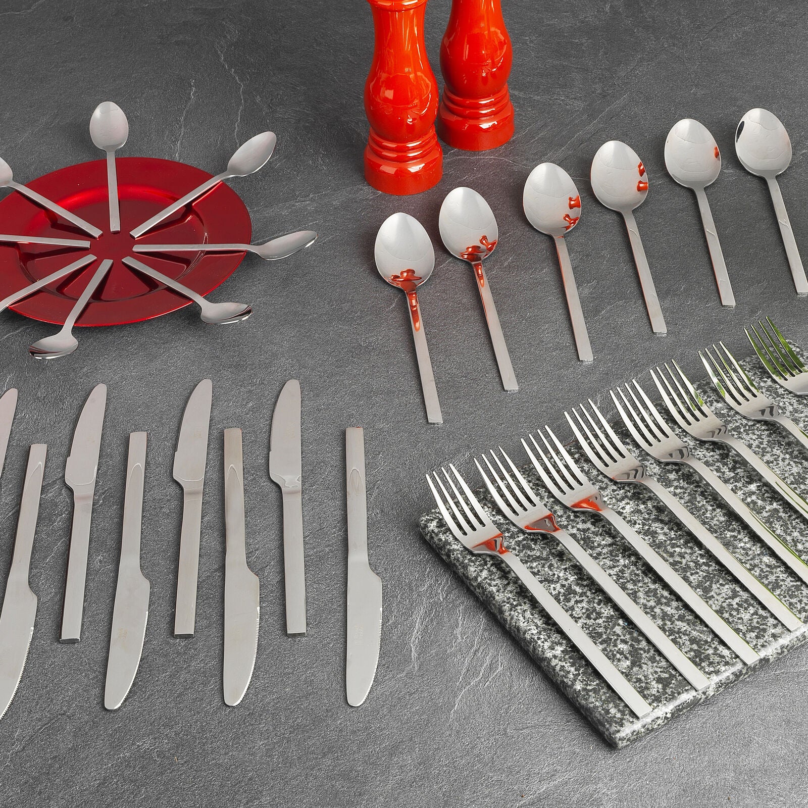 - Rinkinį sudaro keturios 18,5 cm šakutės, keturi 21 cm peiliai, keturi 18,5 šaukštai ir keturi 13 cm arbatiniai šaukšteliai.