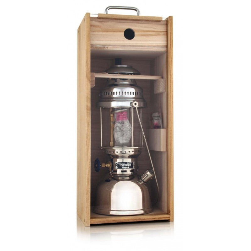 Medinė dėžutė su organinio stiklo priekiu yra rankų darbo. Lakuota mediena yra lengva, bet labai atspari ir apsaugo nuo dulkių ar nešvarumų. Viršutinėje dėžutės dalyje rasite stalčių, kuriame galėsite laikyti kai kuriuos priedus ar atsargines dalis. Tvirta rankena leidžia saugiai nešiotis. Dėžutė tikrai yra elegantiškiausias būdas transportuoti, pristatyti ar laikyti savo Petromax lempą.
