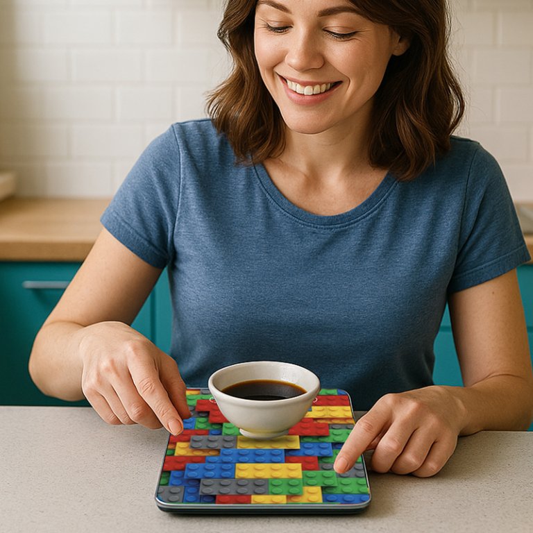 Grūdinto stiklo lėkštė su novatorišku spalvotų plytų raštu puikiai tinka tiems, kurie ieško praktiškumo neprarandant stiliaus.