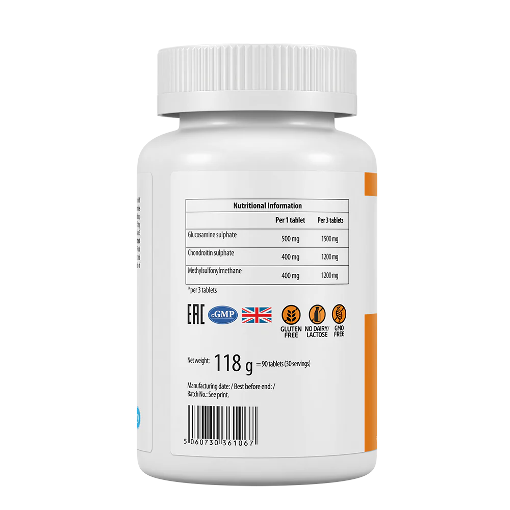 Glucosamine sulphate 2KCl (from crustaceans), chondroitin sulphate sodium, methylsulfonylmethane (MSM), separating agents (magnesium salts of fatty acids, silicon dioxide).