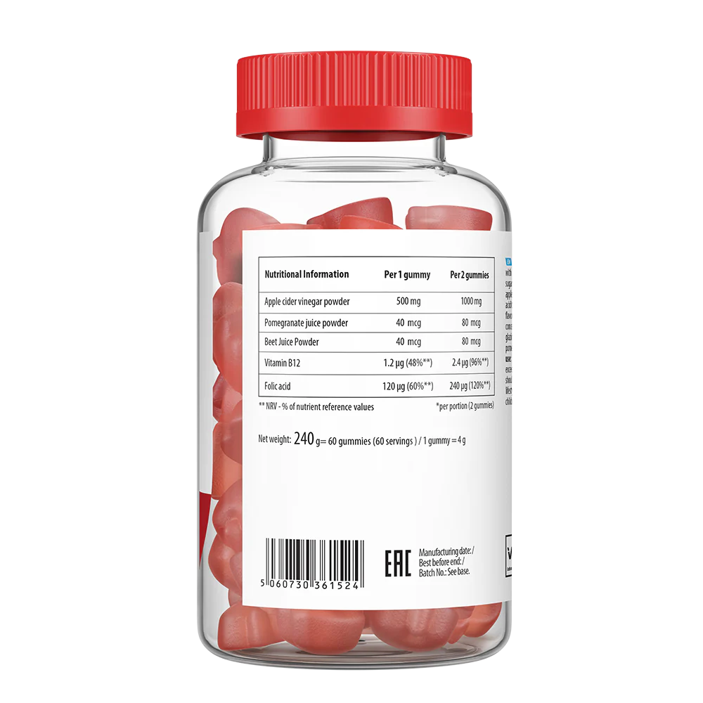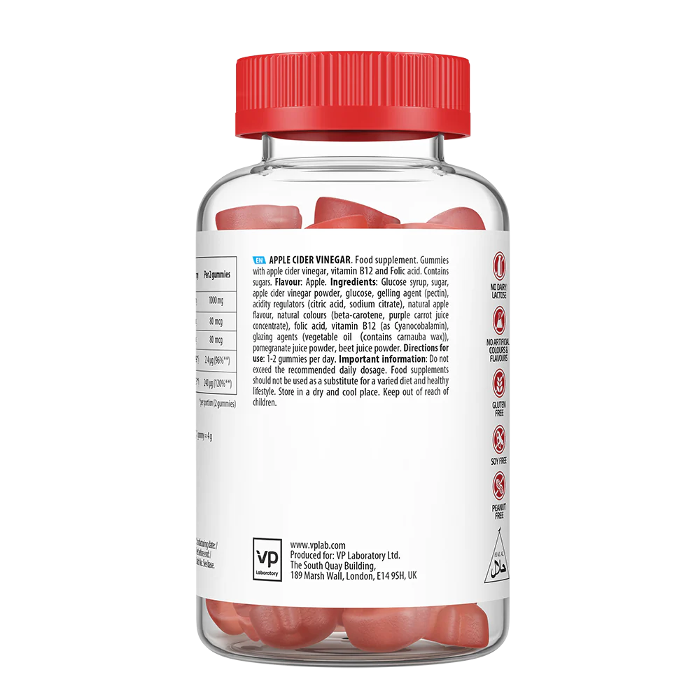 Glucose syrup, sugar, apple cider vinegar powder, glucose, gelling agent (pectin), stabilisers (citric acid, sodium citrate), natural apple flavour, natural colours (beta-carotene, purple carrot juice concentrate), folic acid, vitamin B12 (as Cyanocobalamin), glazing agents (coconut oil, carnauba wax)