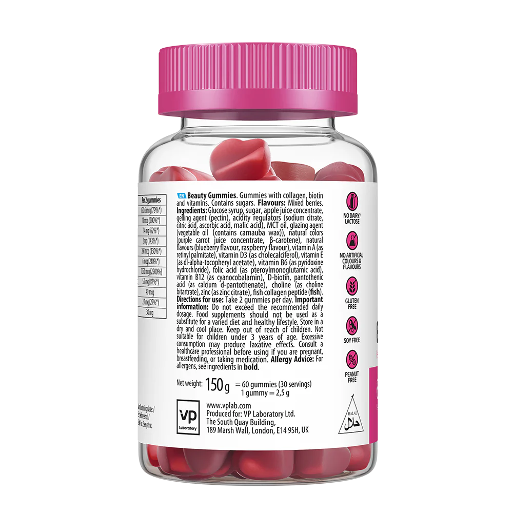 Glucose syrup, sugar, apple juice concentrate, thickener (pectin) (2%), fish collagen peptides, acidity regulators (sodium citrate, citric acid, ascorbic acid, malic acid), MCT oil (medium-chain triglycerides from coconuts), coconut oil, glazing agent (carnauba wax), purple carrot juice concentrate, natural coloring (beta-carotene), natural flavors (blueberry, raspberry), Vitamin A (retinyl palmitate), Vitamin D3 (cholecalciferol), Vitamin E (DL-alpha-tocopheryl acetate), Vitamin B6 (pyridoxine hydrochloride), folic acid (pteroylmonoglutamic acid), Vitamin B12 (cyanocobalamin), D-biotin, pantothenic acid (calcium D-pantothenate), choline (choline bitartrate), zinc (zinc citrate). Gluten-free. Contains no lactose, soy, or peanuts. No added artificial colors or flavors.