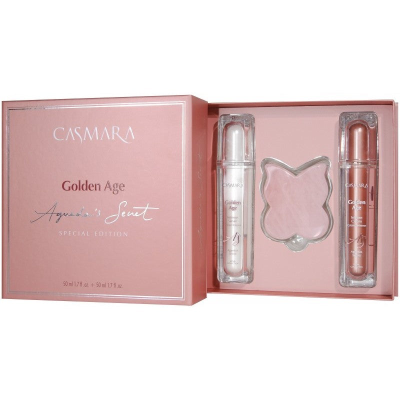 Casmara „Golden Age Agueda's Secret veido priežiūros priemonių rinkinį sudaro Casmara „Golden Age Agueda's Secret Intense Cream“ veido kremas, Casmara Golden Age Agueda's Secret Intense Serum veido serumas ir masažinis veido akmuo „Gua Sha“.