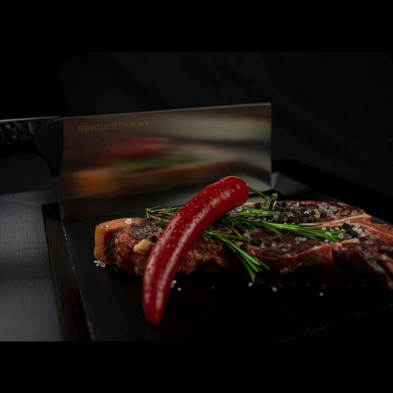 SAMURA ARNY peilis neįprastai lengvas ir universalus - juo jūs galėsite kapoti, smulkinti, pjaustyti ir net semti. Daugiafunkciniam angliškam terminui Cleaver tiesioginio lietuviško atitikmens nėra, todėl naudosime sąvoką kapoklė arba pjaustyklė. Ši moderni kapoklė/pjaustyklė su lenktais ašmenimis leidžia lengvai supjaustyti net švelniausią mėsą ar žuvį, be pastangų susmulkina vaisius ar daržoves. Kiekvienas peilis turi grublėtą TPE (termoplastinio elastomero) rankeną, kuri jau sulaukė pagyrų iš naudotojų dėl atsparumo slydimui. Puikus aukštos kokybės plastiko ir gumos derinys pagerina bendrą sukibimą, todėl rankena tvirtai ir patogiai įsitaisys delne – tai labai svarbu norint tinkamai atlikti reikiamus darbus ir nesusižeisti. Be to, unikalus rankenų dizainas puikiai dera su tvirto ir patikimo japoniško plieno AUS-8 geležtės apdaila Stonewash, kai kiekvienas peilis tiesiog traukia akį bei norisi paimti jį į rankas ir pulti gaminti.