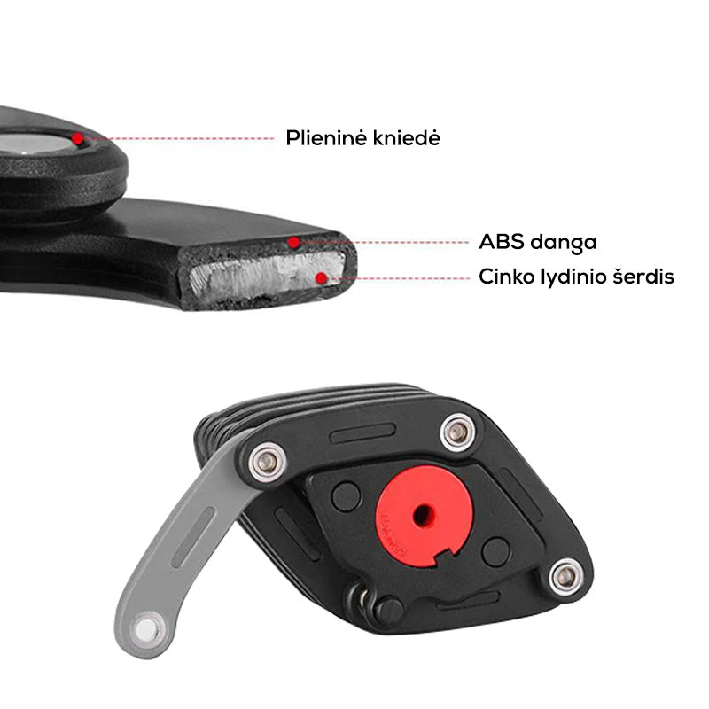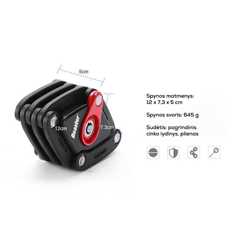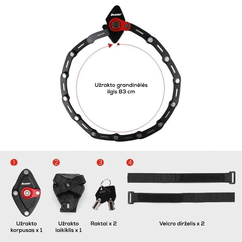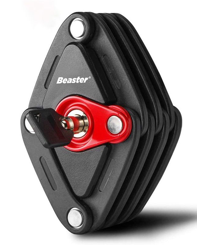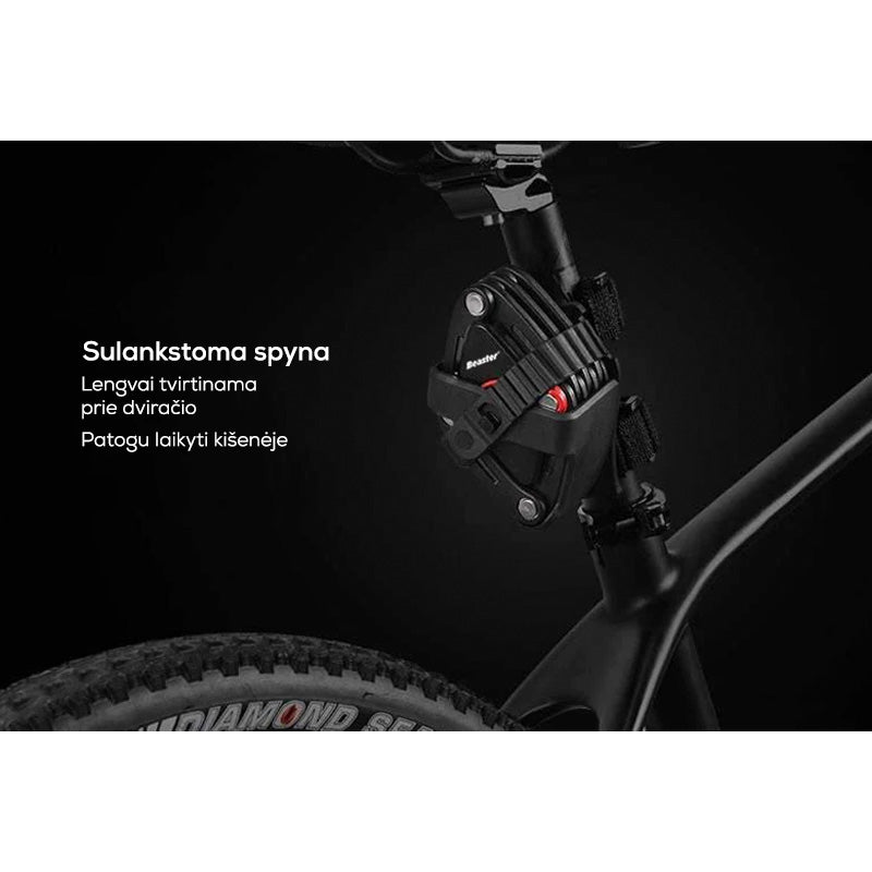 Su šia „Beaster“ sulankstoma spyna jūsų gatvėje paliktas dviratis, el. dviratis ar paspirtukas bus visiškai saugus. Spyna pasižymi paprastu naudojimu ir patogiu laikymu prie rėmo tvirtinamame specialiame laikiklyje su ilgaamžėmis velcro tipo juostomis. Taip pat laikiklį galima prie rėmo priveržti varžtu. Patentuota spyna užrakinama ir atrakinama autentišku raktu.
