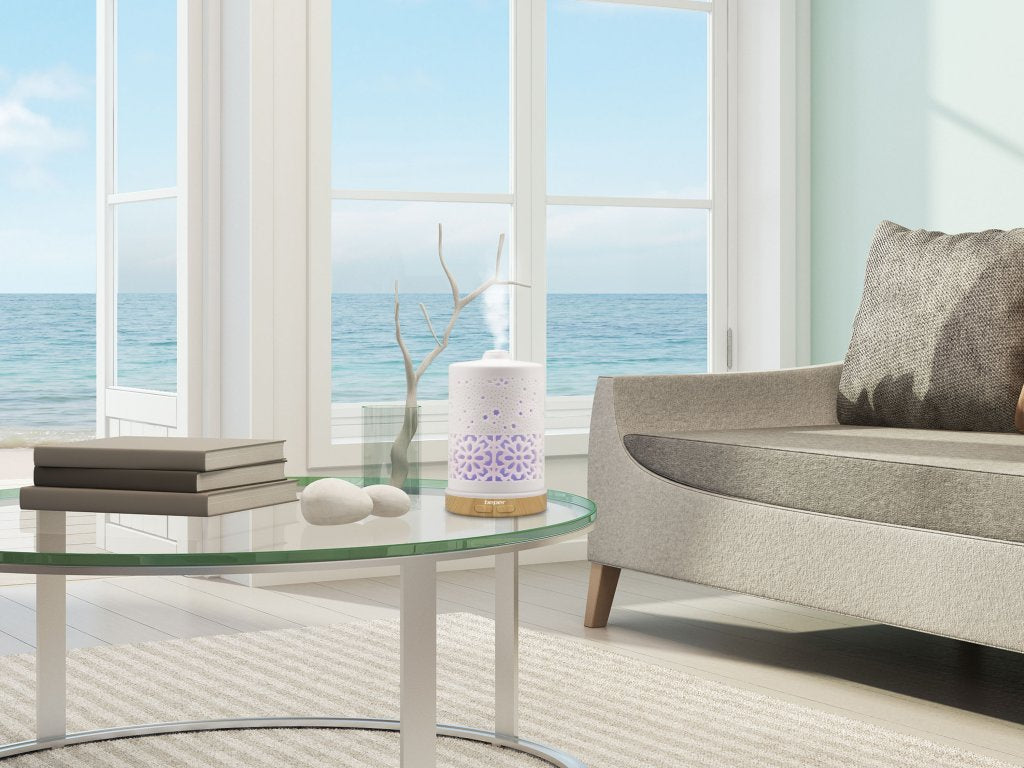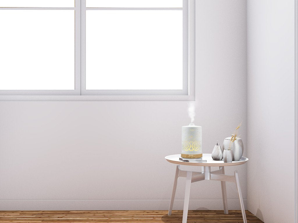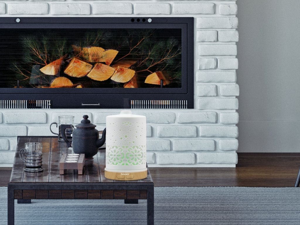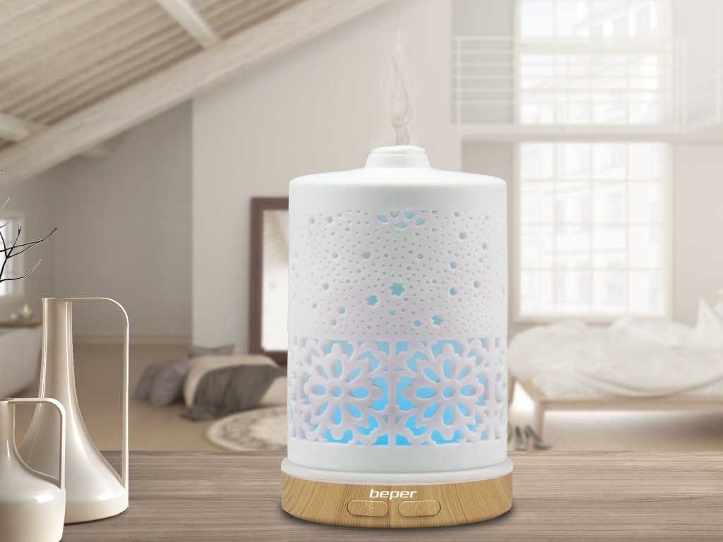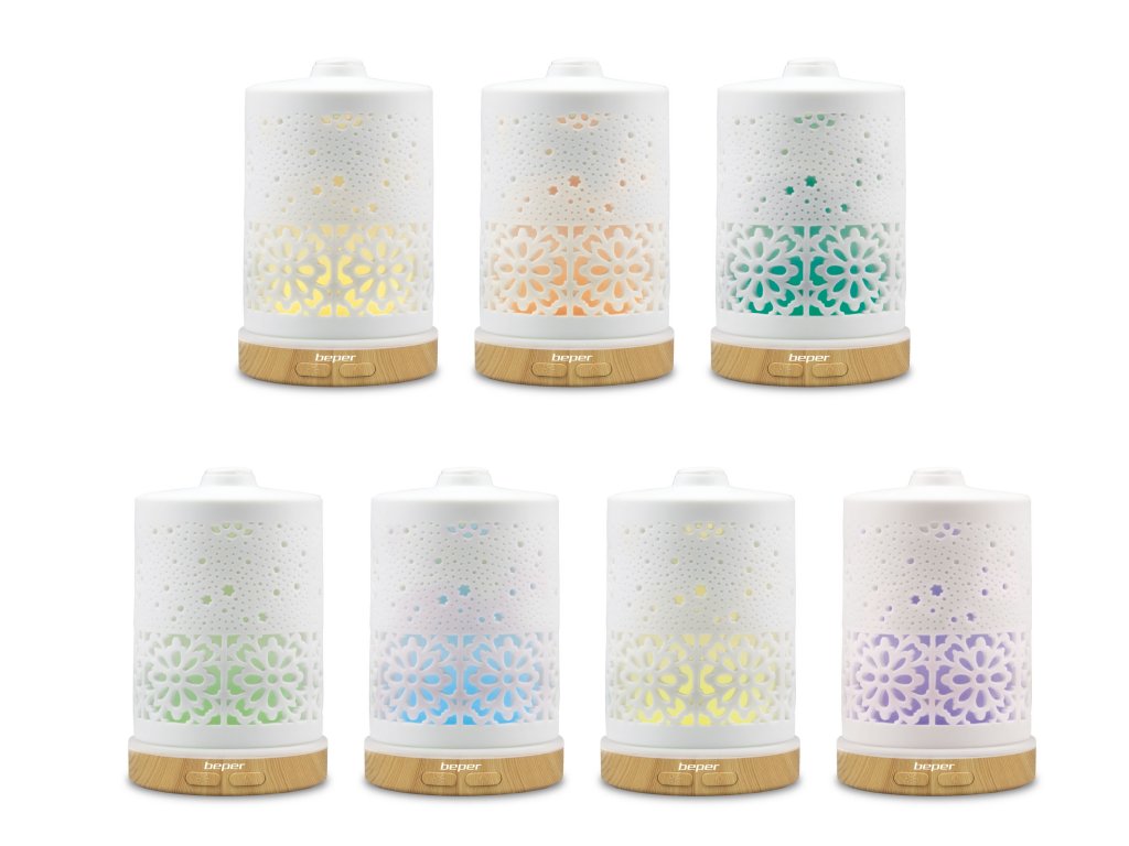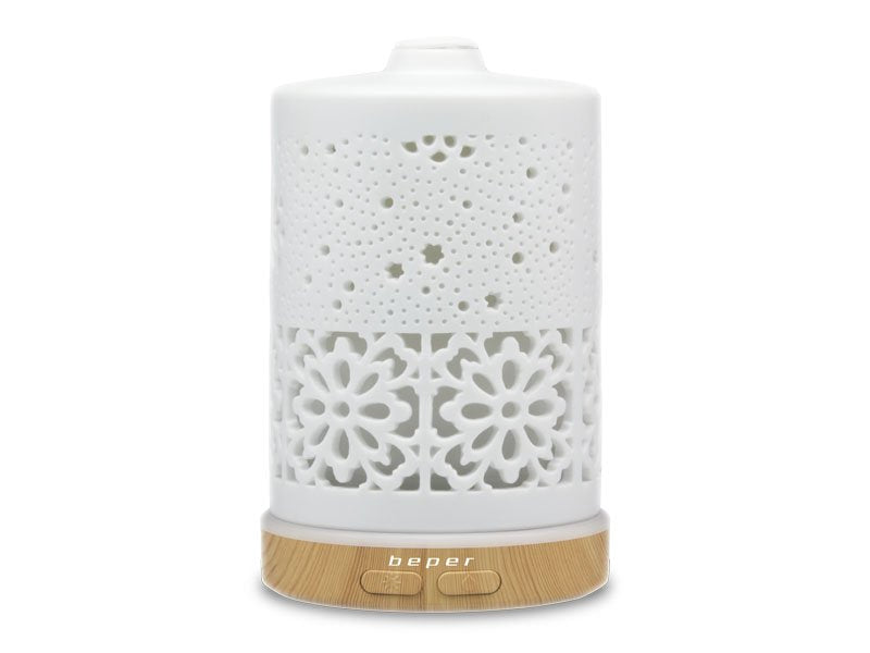 Essence diffuser with ceramic lid, with ultrasonic atomizer and 7-color LED lamp with constantly changing colors. Equipped with a button for choosing the intensity of cold steam, in continuous or intermittent mode, a button for choosing one color. Automatic shut-off when water runs out. Tank capacity 100ml. USB cable included.