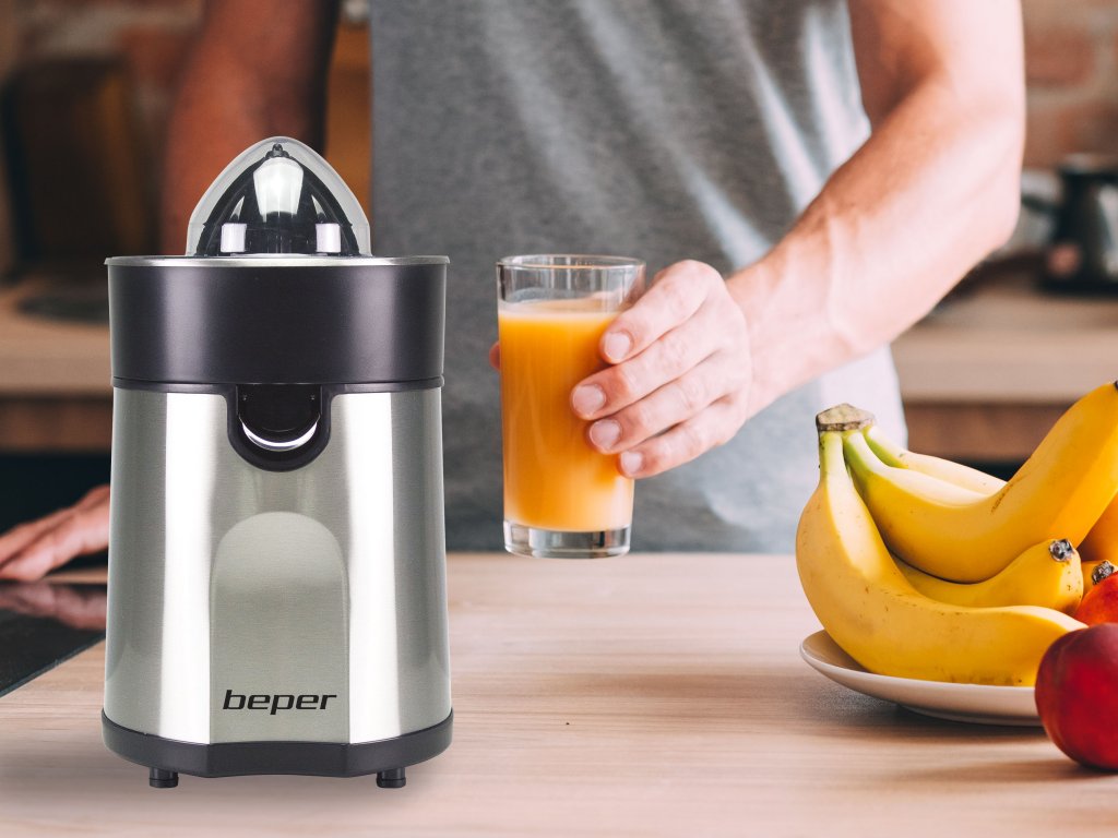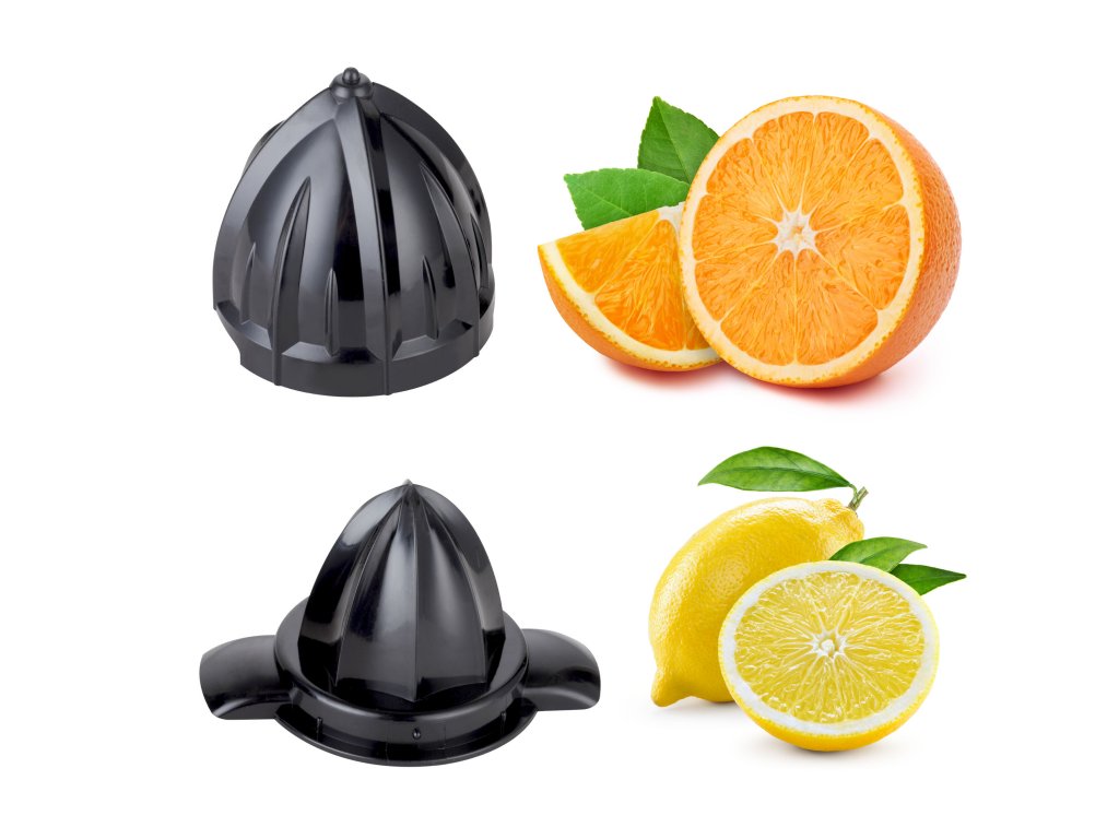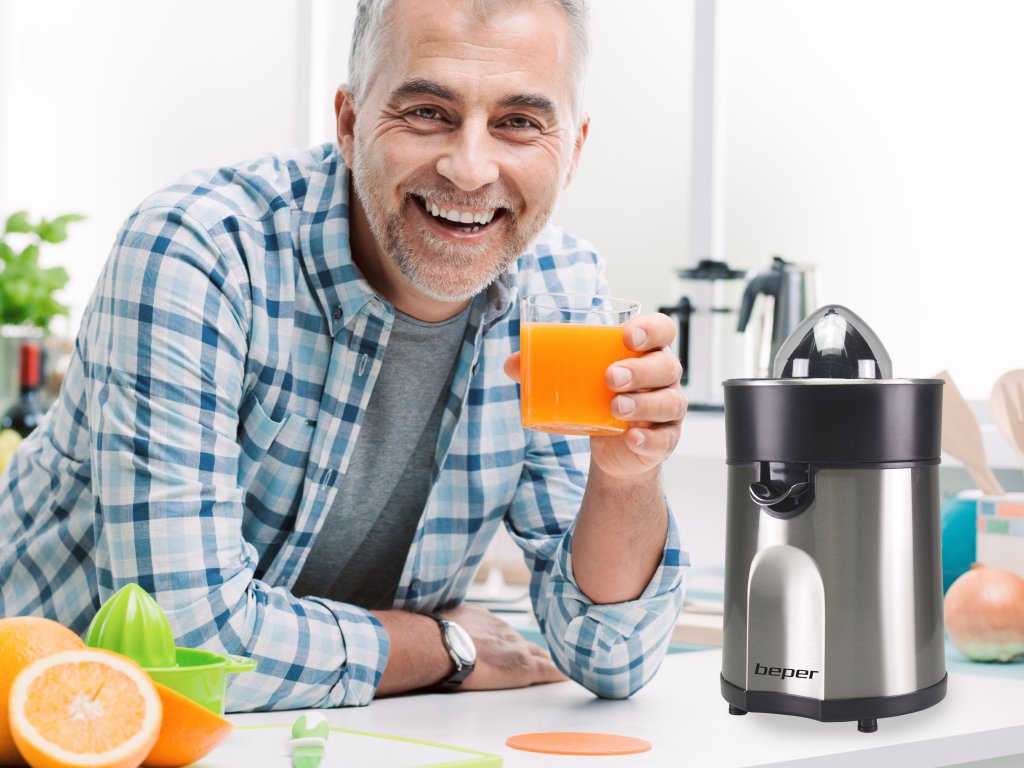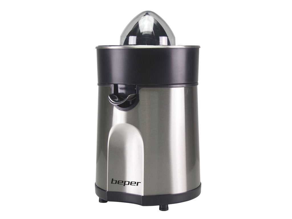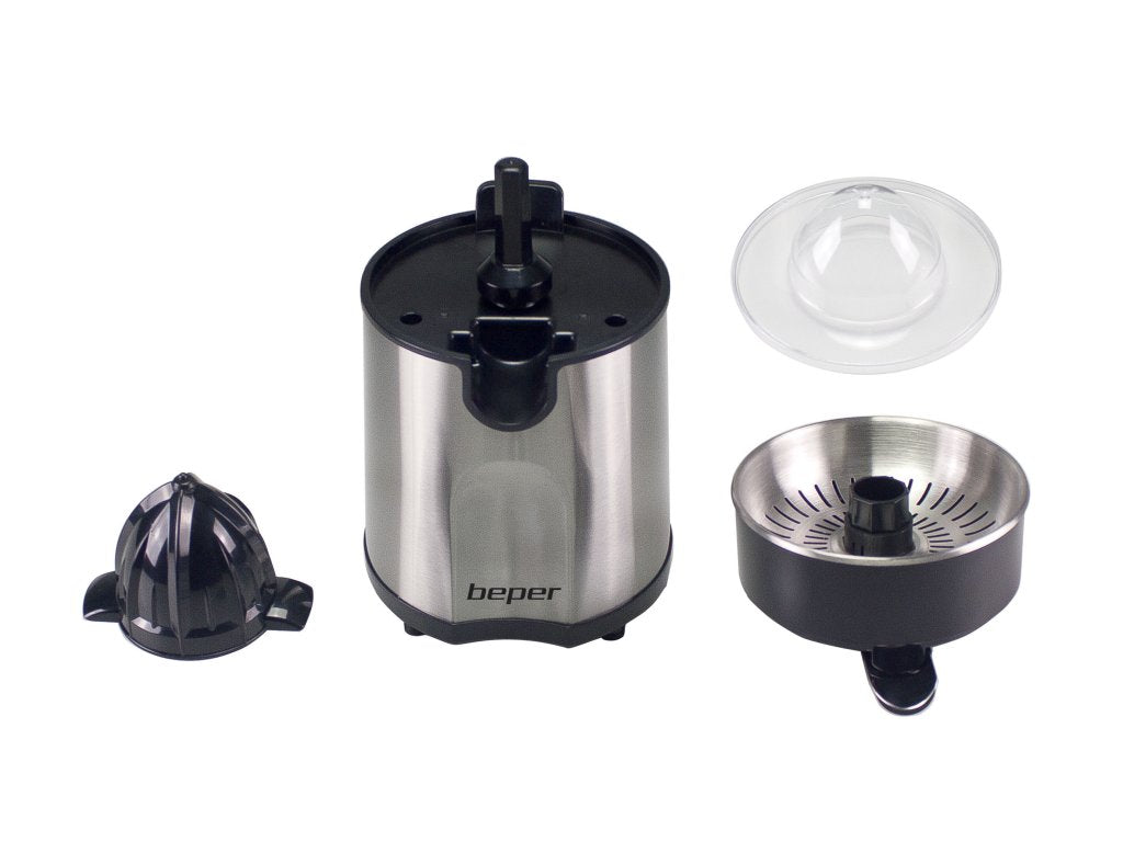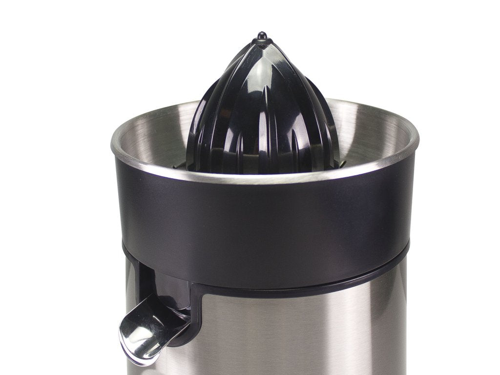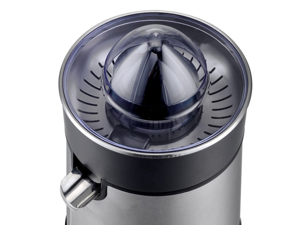 Electric citrus juicer with a steel body, a container with a draining drip spout, so that the juice flows directly into the glass. Two different cones are available for small and large citrus fruits. Equipped with a steel grid and a practical dust cover. Easy to disassemble and clean, non-slip feet ensure stability.