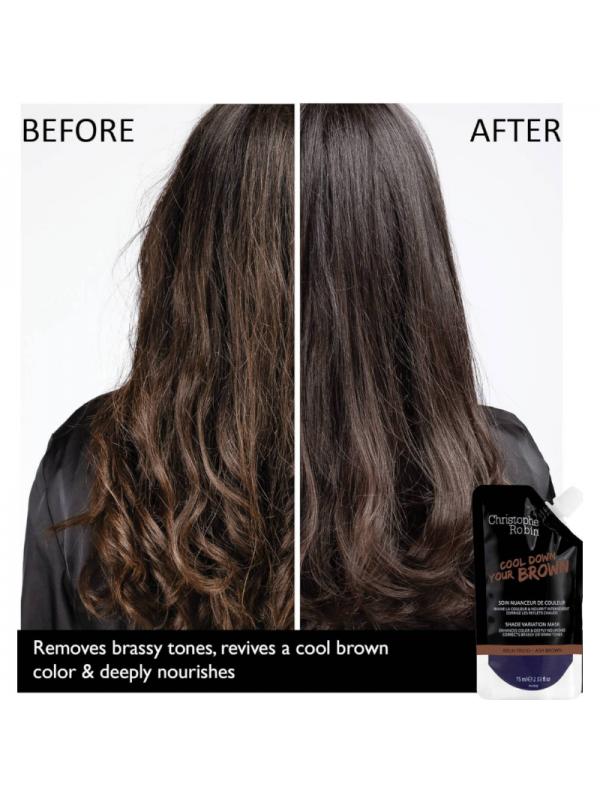 This rich, velvety, coloring hair mask nourishes and nurtures natural hair color or revives dyed and highlighted hair between visits to the hairdresser. The coloring hair mask coats the hair with a unique blend of blue pigments and licorice extracts that neutralize brass and red tones and bring back the coolness of glowing brown.