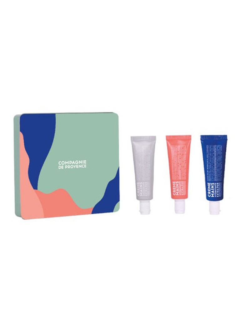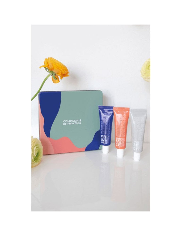 LA COMPANY DE PROVENCE sukūrė naują metalinę dėžutę su trimis patogaus kelioninio dydžio rankų kremais. Atraskite greipfrutų, viduržemio jūros ir medvilnės kvapus. Kalbant apie produktų sudėtį, ištikimai siekdami natūralumo, šiems rankų kremams garantuojame ne mažiau kaip 96% natūralios kilmės ingredientų. Jie drėkina odą, ramina ją ir apsaugo nuo išorinių neigiamų veiksnių.