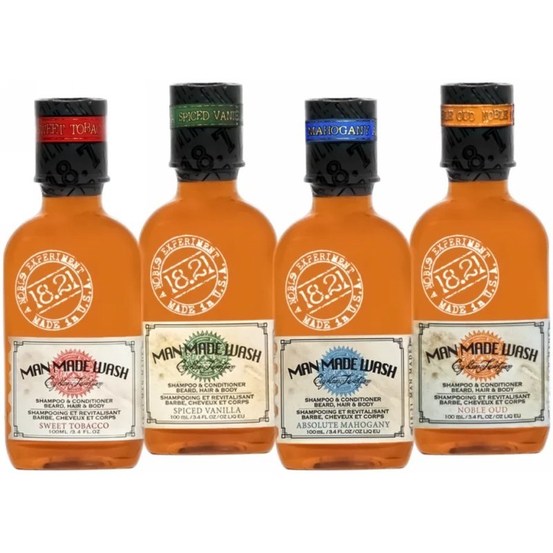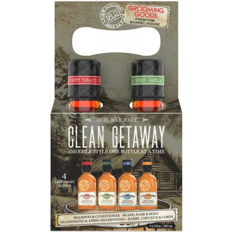 18.21 Man Made „Clean Getaway“ plaukų priežiūros priemonių rinkinį sudaro 18.21 Man Made „Wash Absolute Mahogany“, 18.21 Man Made „Wash Noble Oud“, 18.21 Man Made „Wash Spiced Vanilla“ ir 18.21 Man Made „Wash Sweet Tobacco“ daugiafunkcės priemonės 3 in 1.