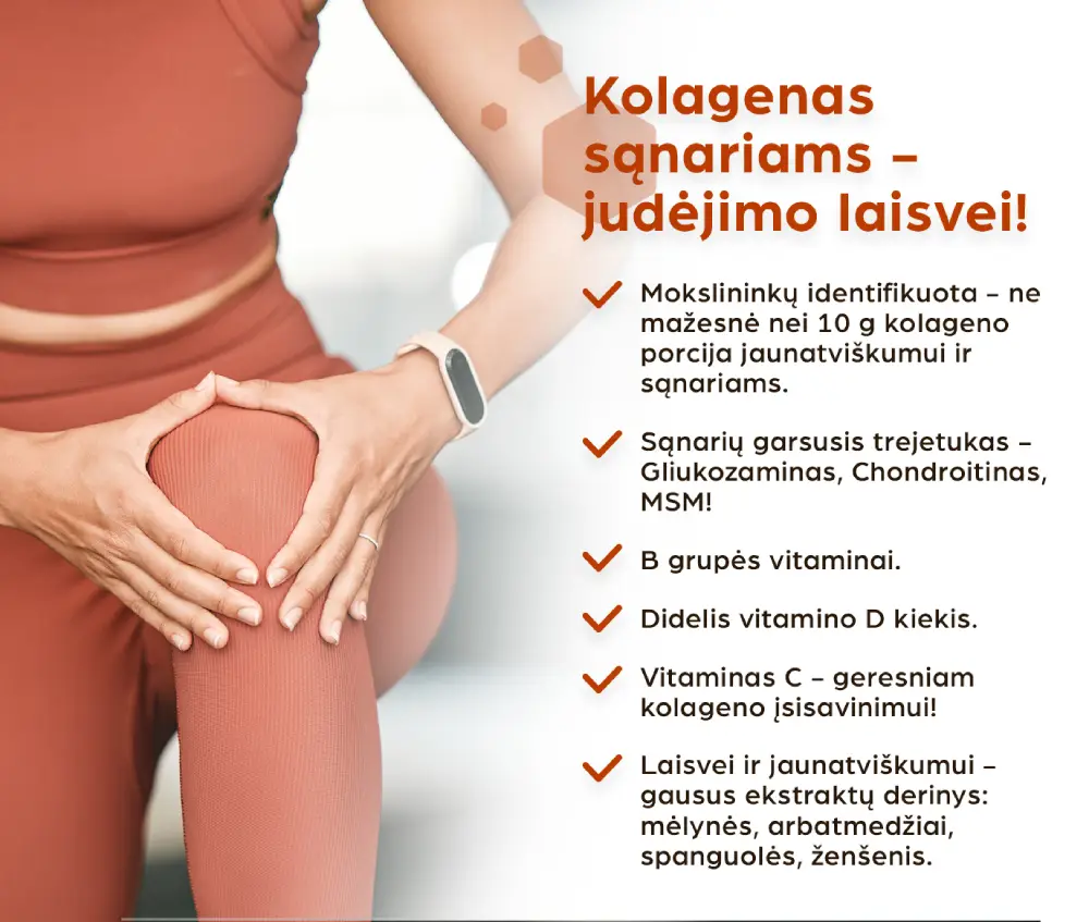 The composition created by Lithuanian scientists - oral collagen with synergistic botanical extracts and a rich amount of vitamins - vitamin C (2.5 x daily norm), vitamin D (6 x daily norm), pantothenic acid (daily norm), vitamin B12 (2, 5 x daily rate), biotin (2 x daily rate).