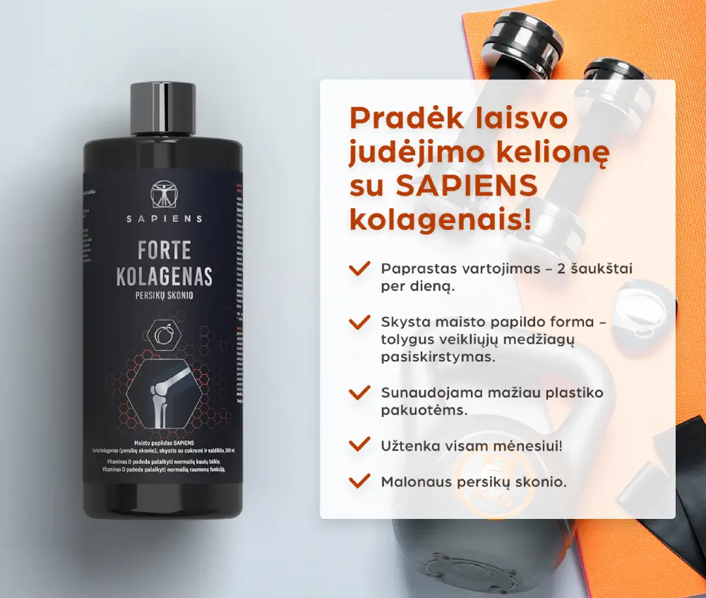 One of the most important indicators of the quality of life is movement. Joints are one of the most important parts of movement. And the state of the whole organism often depends on movement. In order for the joints to perform their work, it is useful to take care of the condition of not only the joints, but also the bones and muscles. SAPIENS FORTE collagen is hydrolyzed, extremely thick collagen for joints, bones, muscles, which is enriched with vitamin D (6 x daily rate), vitamins B6 and B12 and biotin. There is almost no such composition of FORTE collagen on the market. Our Lithuanian scientists have expanded the composition with botanical extracts and vitamins that work synergistically.