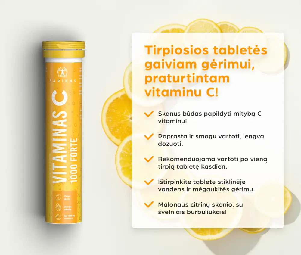SAPIENS Vitamin C 1000 Forte – as much as 1000 mg of vitamin C in each serving! This component is extremely important for the overall functioning of the immune system (Vitamin C helps maintain normal immune system function), helps protect cells from oxidative stress (Vitamin C helps protect cells from oxidative damage) and provides energy for active physical activity (Vitamin C helps maintain normal energy metabolism).