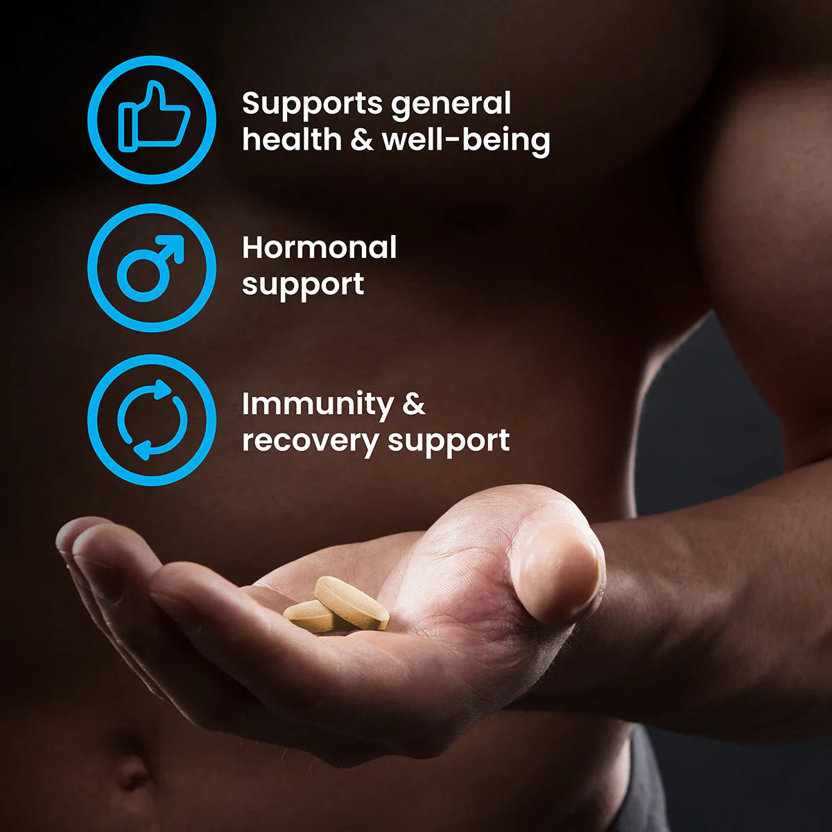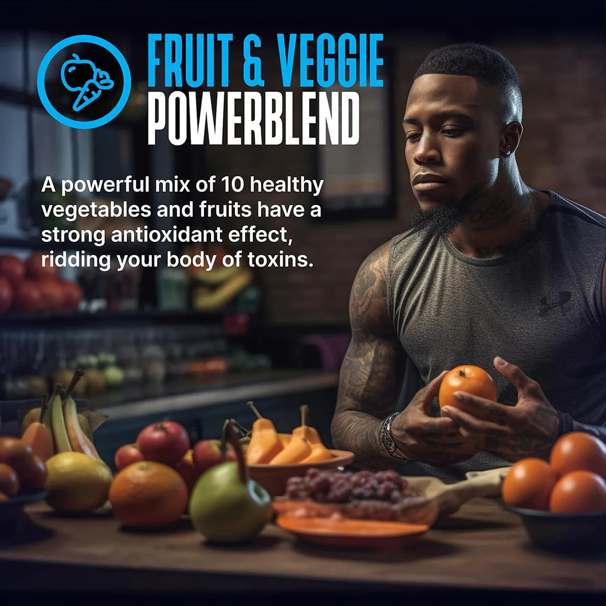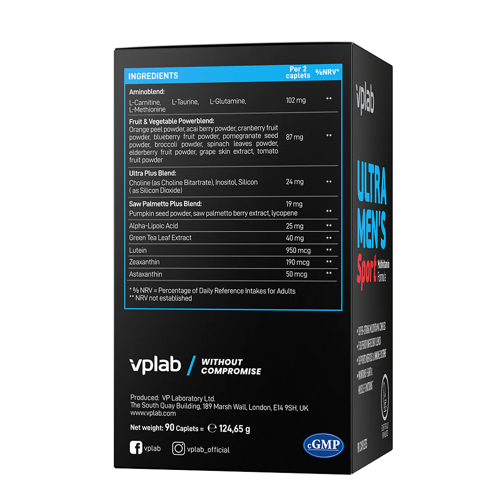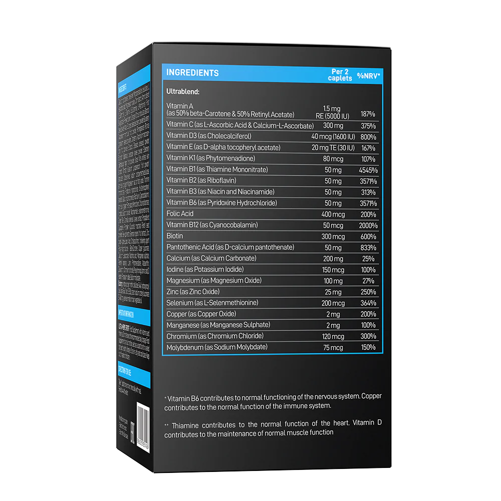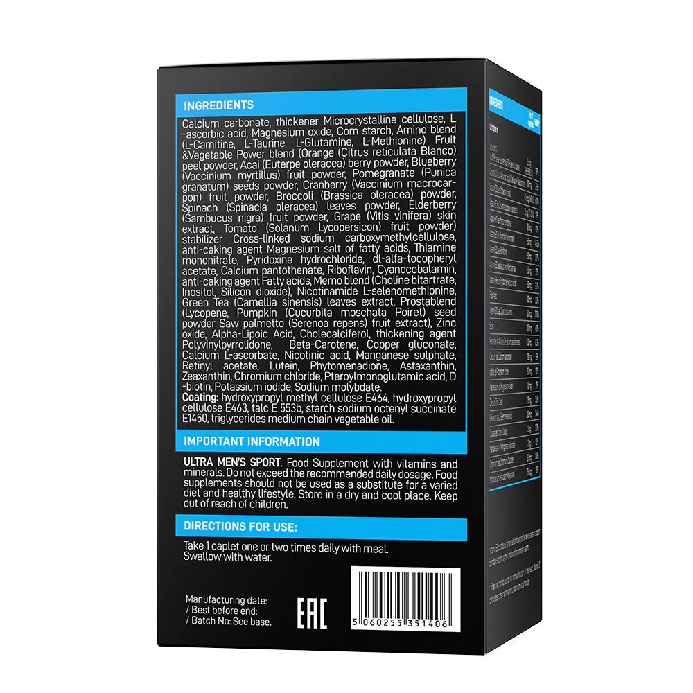 Calcium carbonate, thickener Microcrystalline cellulose, L -ascorbic acid, magnesium oxide, Corn starch, Amino blend (L-carnitine, L-taurine, L-glutamine, L-methionine), Fruit &Vegetable Power blend (Orange (Citrus reticulata Blanco) peel powder, Acai (Euterpe oleracea) berry powder, Blueberry (Vaccinium myrtillus) fruit powder, Pomegranate (Punica granatum) seeds powder, Cranberry (Vaccinium macrocarpon) fruit powder, Broccoli (Brassica oleracea) powder, Spinach (Spinacia oleracea) leaves powder, Elderberry (Sambucus nigra) fruit powder, Grape (Vitis vinifera) skin extract, Tomato (Solanum Lycopersicon) fruit powder), stabilizer Cross-linked sodium carboxymethylcellulose, anti-caking agent Magnesium salt of fatty acids, Thiamine mononitrate, Pyridoxine hydrochloride, dl-alfa-tocopheryl acetate, Calcium pantothenate, Riboflavin, Cyanocobalamin, anti-caking agent Fatty acids, Memo blend (Choline bitartrate, Inositol, Silicon dioxide), Nicotinamide, L-selenomethionine, Green Tea (Camellia sinensis) leaves extract, Prostablend (Lycopene, Pumpkin (Cucurbita moschata Poiret) seed powder, Saw palmetto (Serenoa repens) fruit extract), Zinc oxide, Alpha-lipoic acid, Cholecalciferol, thickening agent Polyvinylpyrrolidone, Beta-carotene, Copper gluconate, Calcium L-ascorbate, Nicotinic acid, Manganese sulphate, Retinyl acetate, Lutein, Phytomenadione, Astaxanthin, Zeaxanthin, Chromium chloride, Pteroylmonoglutamic acid, D -biotin, Potassium iodide, Sodium molybdate.