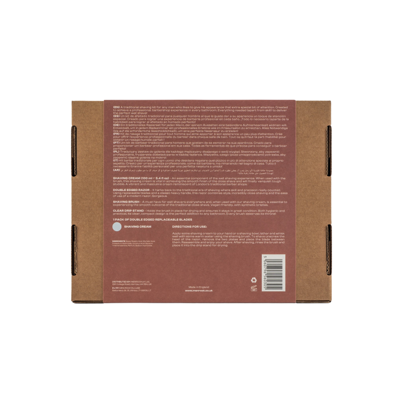 Rinkinį sudaro santalmedžio aromato skutimosi kremas, sintetinių šerių skutimosi šepetėlis, laikiklis šepetėliui ir dviašmenis skustuvas - tai pagrindiniai produktai, kurie suteikia skutimosi malonumą.