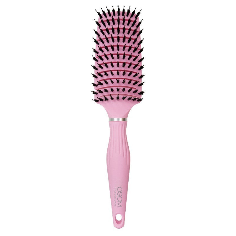OSOM Professional Flexible Hair Brush With Boar and Nylon Bristles šepetys plaukams su natūralių šerno ir nailono šerelių deriniu, sukurtas efektyviam plaukų šukavimui ir formavimui. Šerno šereliai padeda tolygiai paskirstyti natūralų galvos odos sebumą per visą plaukų ilgį, suteikdami plaukams glotnumo ir natūralaus žvilgesio, o nailono šereliai lengvai slysta plaukais ir užtikrina švelnų iššukavimą. Ergonomiška rankena su neslystančia guminės dangos („rubber finish“) danga suteikia patogų ir stabilų sukibimą net intensyvaus darbo metu.