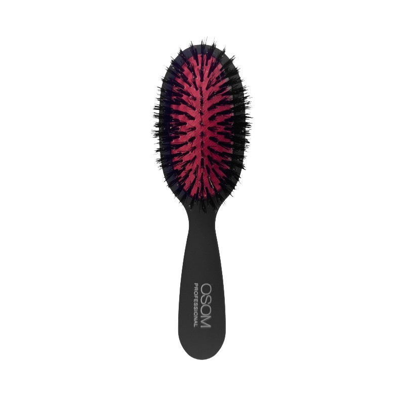 OSOM Professional „Hair Brush With Boar Bristles“ šepetys plaukams su natūraliais šerno šereliais, skirtas švelniam ir kruopščiam plaukų šukavimui bei glotninimui. Šerno šereliai padeda tolygiai paskirstyti natūralų galvos odos sebumą per visą plaukų ilgį, suteikdami jiems šilkinio glotnumo ir natūralaus žvilgesio. Ergonomiška rankena su neslystančia gumine danga („rubber finish“) užtikrina patogų ir saugų laikymą šukuojant.