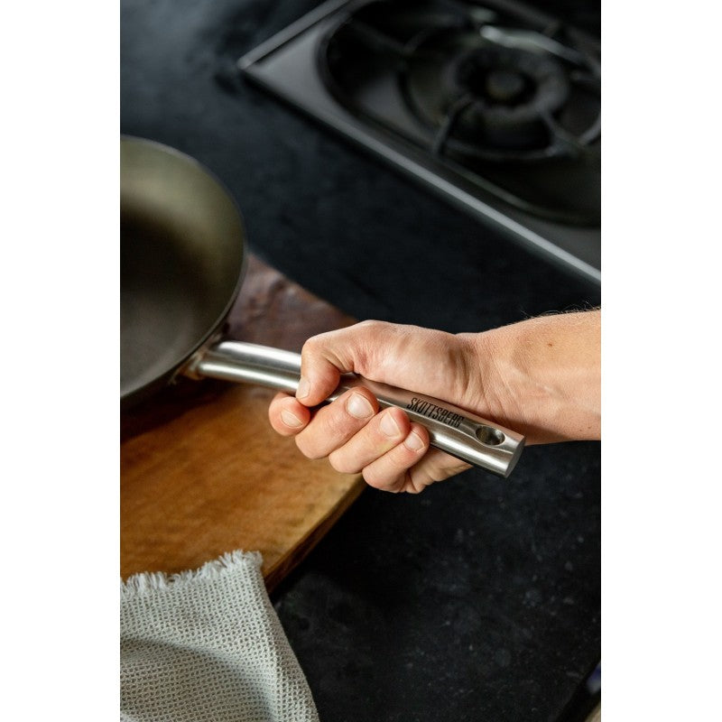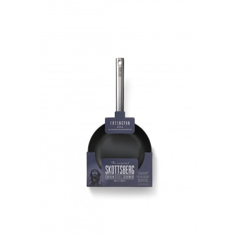 SKOTTSBERG® anglies plieno keptuvė yra vertinama dėl daugybės ypatingų savybių. Keptuvė iš anksto padengta augaliniu aliejumi, todėl lengvai nepridega. Be to, keptuvės dugnas yra 2,5mm, kad kaitinimo metu keptuvės dugnas neišsikreiptų. Keptuvės rankena yra tuščiavidurė, tad nesugeria šilumos iš keptuvės ir nekaista.