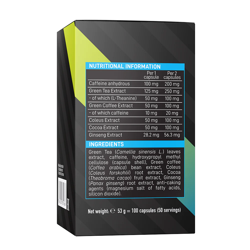 Green tea (Camellia sinensis L.) leaves extract, caffeine, hydroxypropyl methyl cellulose (capsule shell), Green coffee (Coffea arabica) bean extract, Coleus (Coleus forskohlii) root extract, Cocoa (Theobroma cacao) fruit extract, Ginseng (Panax ginseng) root extract, anti-caking agents (magnesium salt of fatty acids, silicon dioxide).