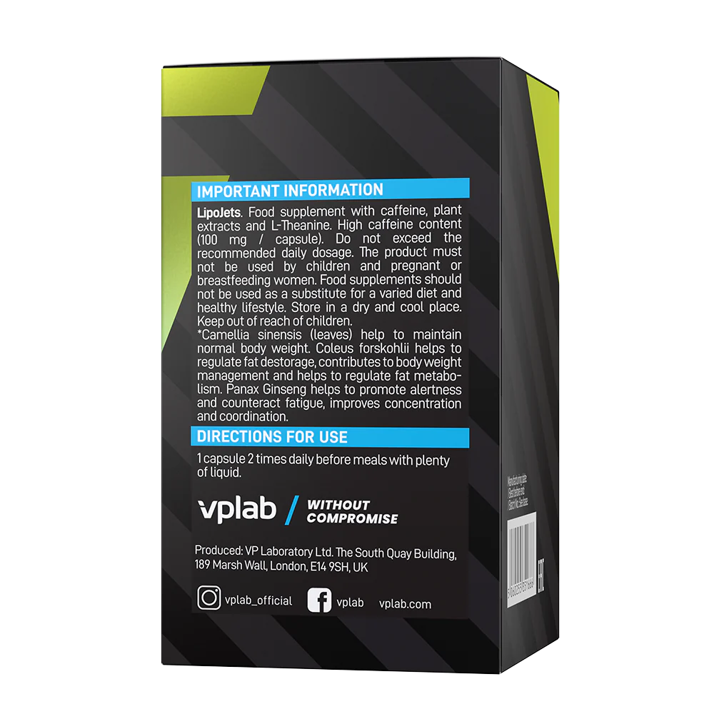 Pagreitinkite medžiagų apykaitą ir suteikite energijos savo treniruotėms su Vplab LIPOJETS. Šis produktas sukurtas efektyviam riebalų ir angliavandenių deginimui bei alkio jausmo mažinimui, todėl taps puikiu jūsų sąjungininku prieš treniruotes. Vienoje pakuotėje – 100 lengvai praryjamų kapsulių, kurios padės siekti dar geresnių rezultatų sportuojant ir aktyvins medžiagų apykaitą.