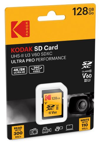 Kodak SDXC UHS-II U3 V60 atminties kortelė pasižymi neįtikėtinu našumu, kuris puikiai tinka programėlių, nuotraukų ir vaizdo įrašų atsisiuntimui, perkėlimui ir bendrinimui.