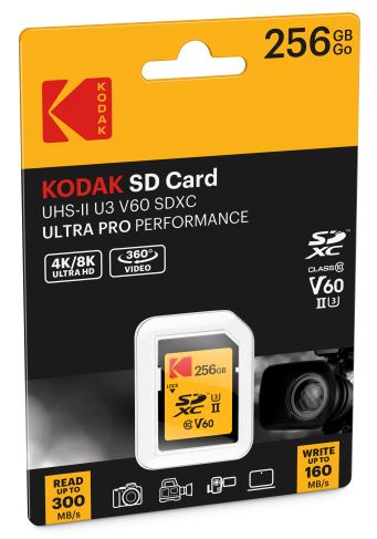 Kodak SDXC UHS-II U3 V60 atminties kortelė pasižymi neįtikėtinu našumu, kuris puikiai tinka programėlių, nuotraukų ir vaizdo įrašų atsisiuntimui, perkėlimui ir bendrinimui.