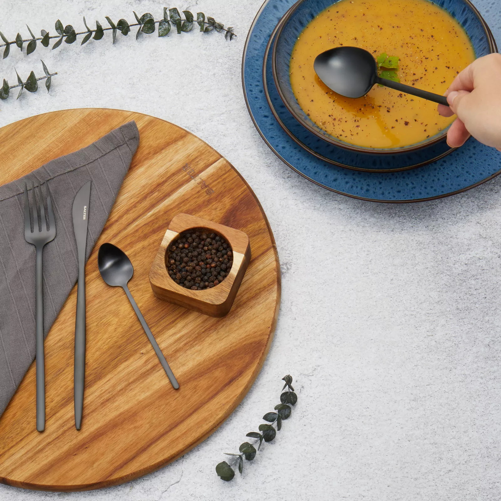 | Rinkinyje | 4 peiliai (5,5 mm), 4 šakutės (3,0 mm), 4 valgomieji šaukštai (3,0 mm), 4 arbatiniai šaukšteliai (2,0 mm) |