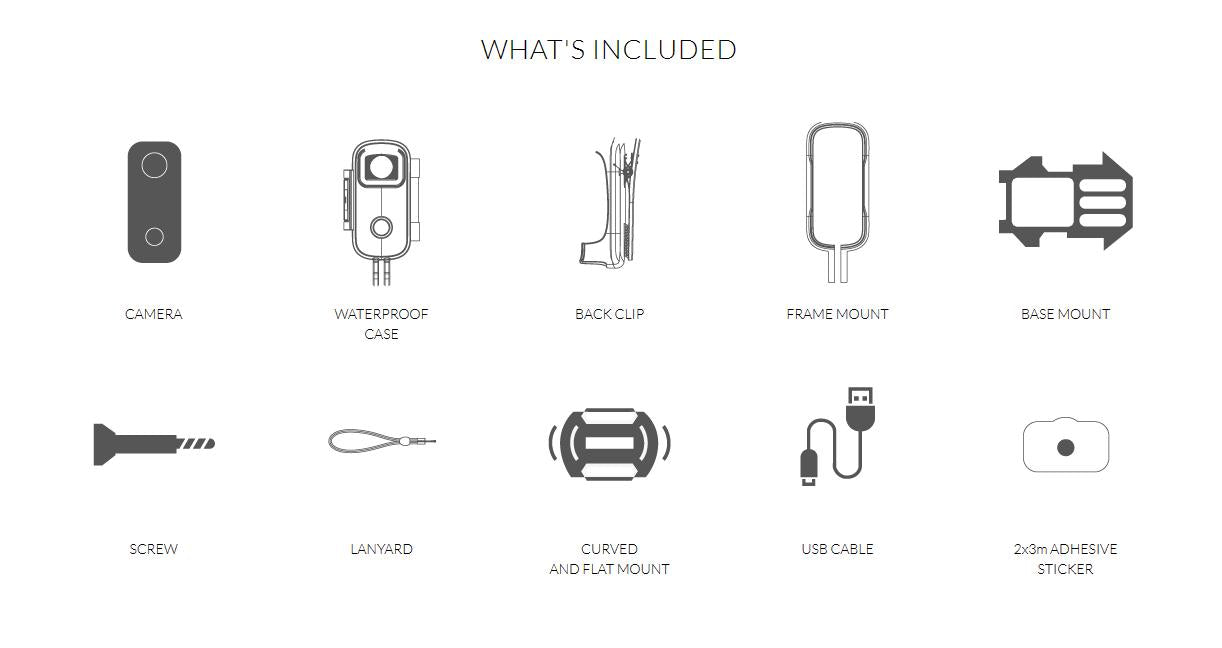 | Įskaitant | Fotoaparatas, vandeniui atsparus dėklas, užpakalinis segtukas, rėmo laikiklis, pagrindo laikiklis, varžtas, diržas, lenktas ir plokščias laikiklis, USB laidas, 2x3 m lipdukas |