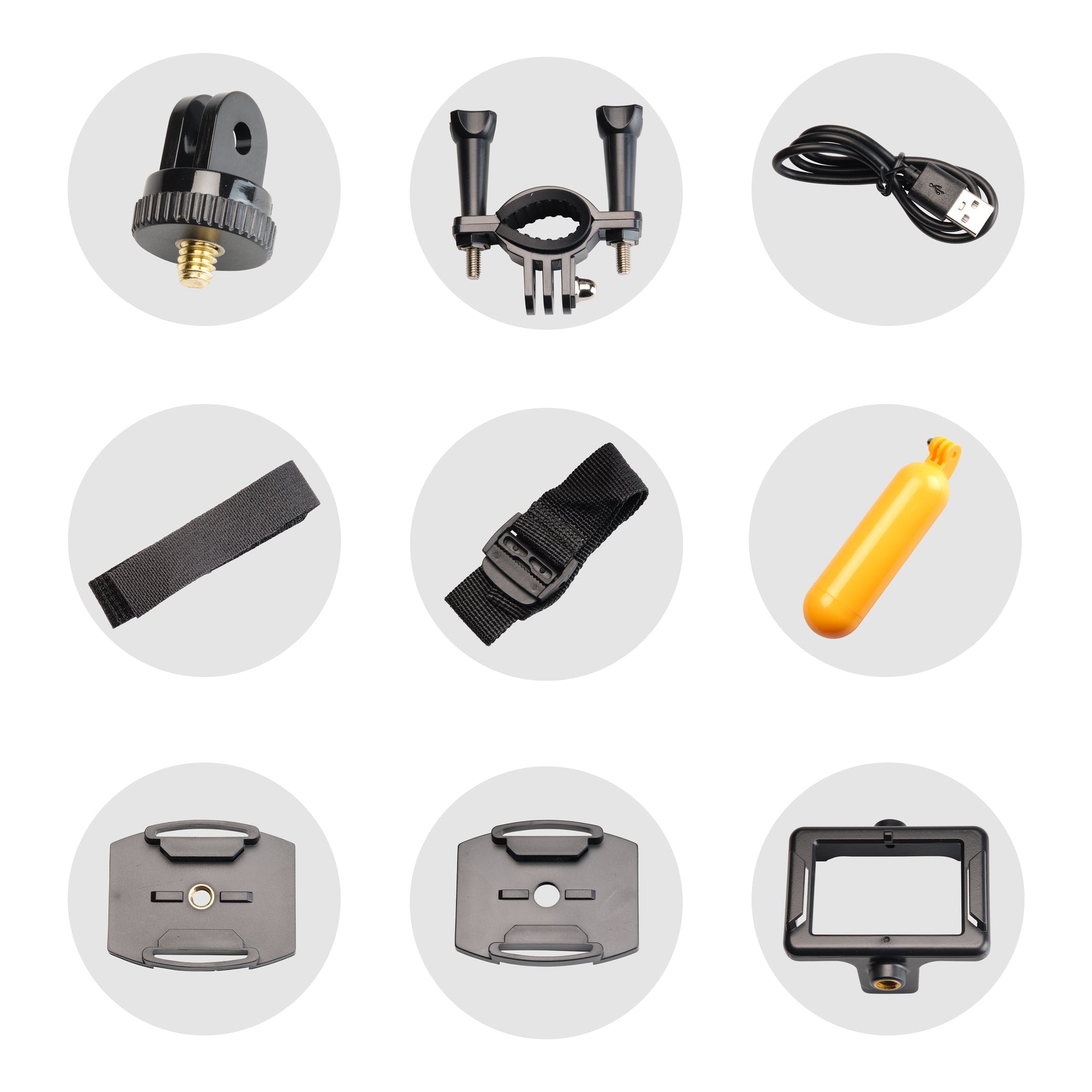 Priedai Vandeniui atsparus dėklas (IPX68), plūduras, segtukas, šalmo pagrindas, laikiklis dviračiui, tvarstis, USB tipo C laidas, pagrindas, jungiklio atrama, fiksuotas pagrindas