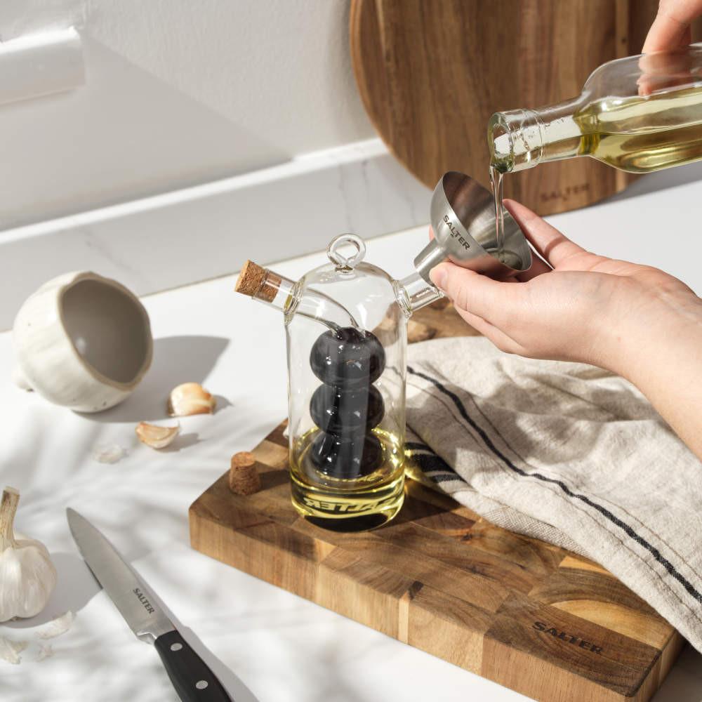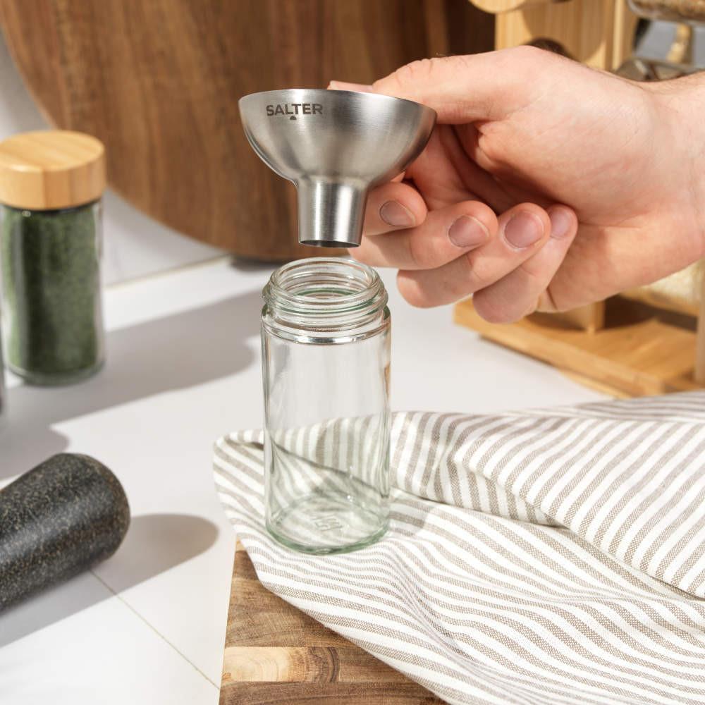 Piltuvėlio papildymas: Norite papildyti savo malūnėlius be jokios netvarkos? Dėl „Salter“ pildymo piltuvėlio galite lengvai perkelti tiek šlapius, tiek sausus ingredientus iš vienos vietos į kitą, nesijaudindami dėl nešvarių virtuvės paviršių valymo.