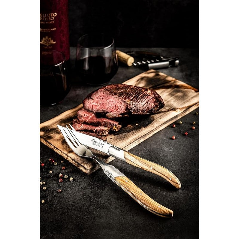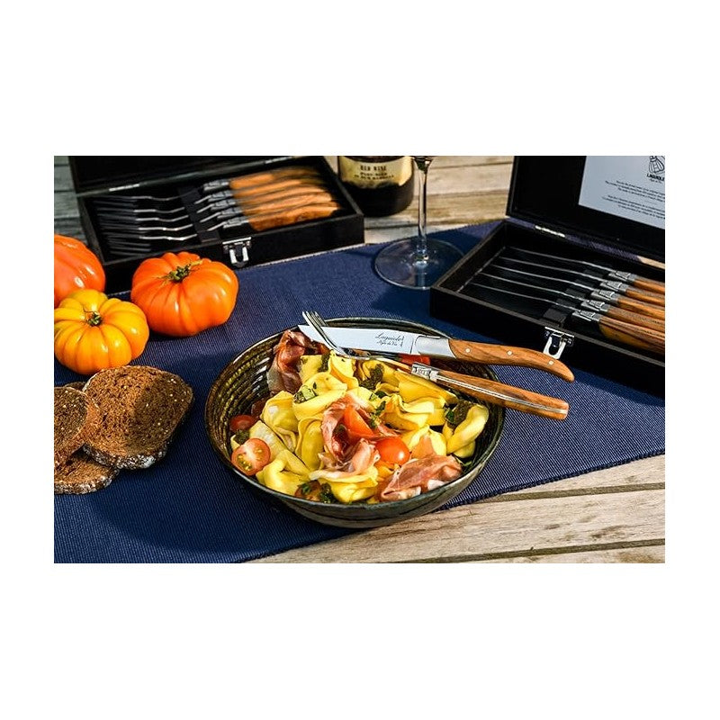 Vienas iš bestselerių! Alyvmedžio produktų serija "Luxury Line". Su 6 dalių šakučių rinkiniu jūsų kepsnių peilių ir šaukštų rinkinys bus visiškai sukomplektuotas. Gražiai apdailinta alyvmedžiu, ši serija tinka kiekvieniems namams ir kiekvienai aplinkai. Šakutės yra 2,5 mm storio, todėl jas patogu laikyti. Šios serijos negalima plauti indaplovėje. Jos tiekiamos prabangioje juodoje dėžutėje.
