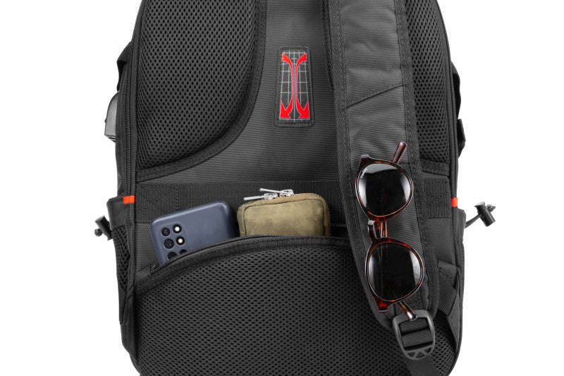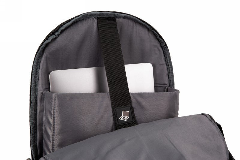 Šioje kuprinėje yra integruota USB ir ausinių AUX jungtys, jog savo telefoną, planšetinį kompiuterį ar kitus įrenginius galėtumėte pasikrauti bet kokiu metu, prijungus išorinę bateriją. Tai itin patogu kelionių metu.