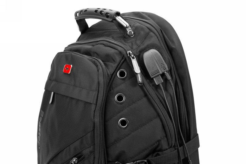 Šioje kuprinėje yra integruota jungtis ausinėms prijungti, kad galėtumėte patogiai prijungti ausines prie kuprinės viduje esančių įrenginių.