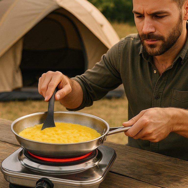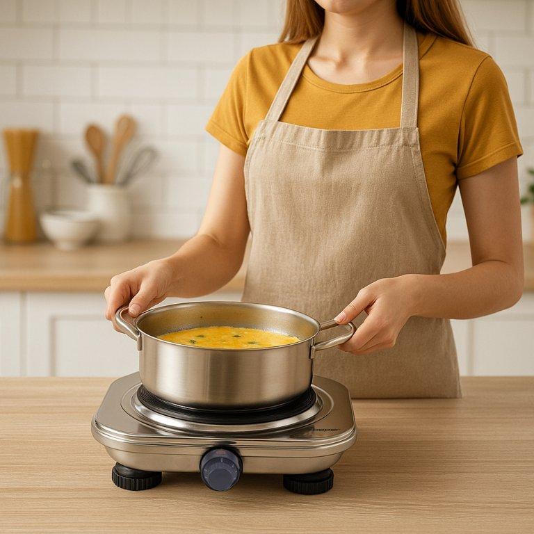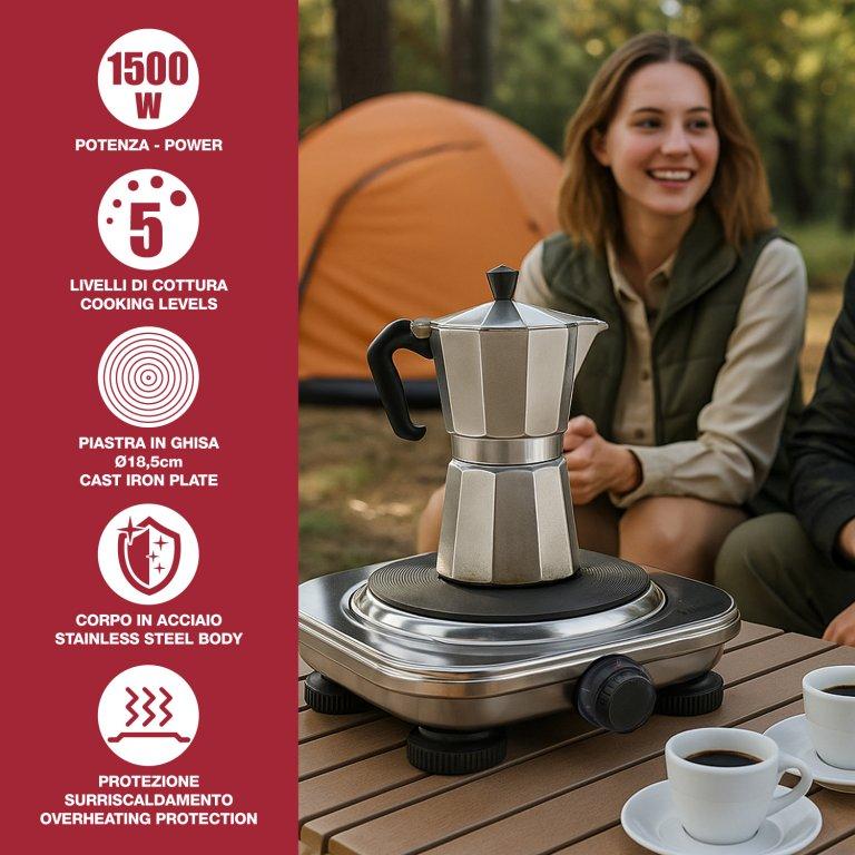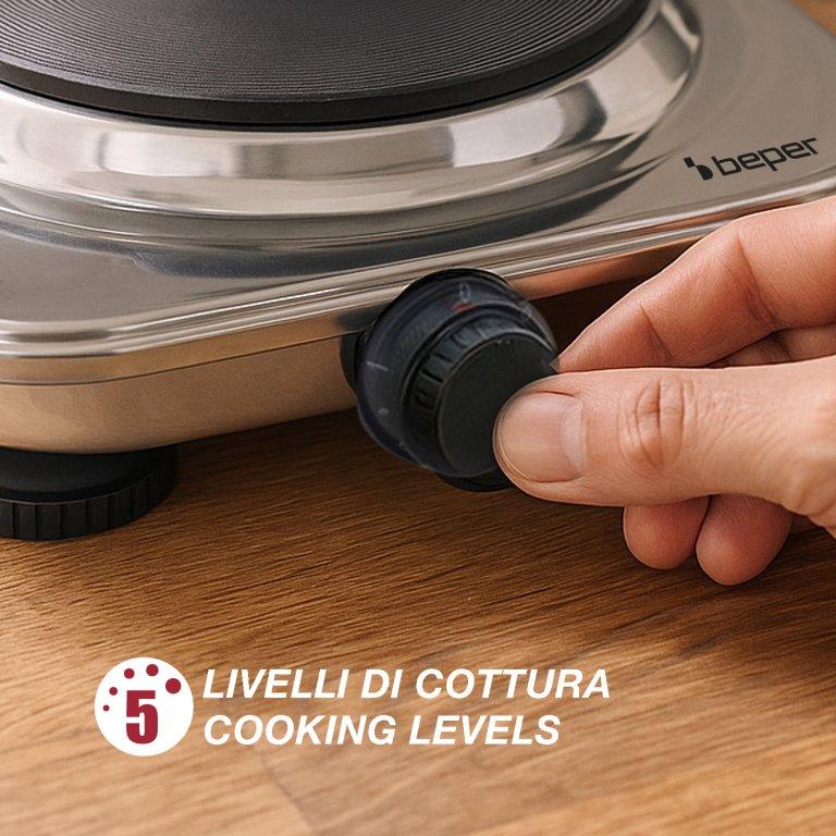Mūsų elektrinė viryklė sujungia funkcionalumą ir patikimumą dėl tvirto plieninio korpuso ir 18,5 cm ketaus plokštės, užtikrinančios tolygų šilumos paskirstymą.