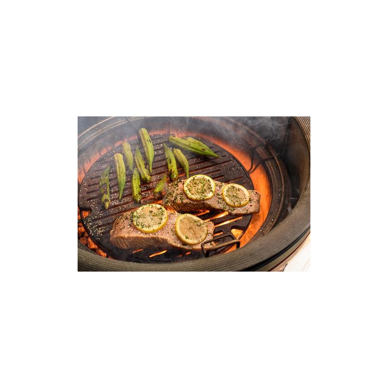 Благодаря отличному сохранению тепла и длительной прочности изделия из чугуна идеально подходят для приготовления мяса на гриле. Каждая сторона оставляет уникальный след гриля, чрезвычайно прочная, антипригарная, легкоочищаемая поверхность. Подходит для Kamado Joe Jr, диаметр 35 см.