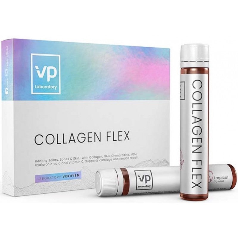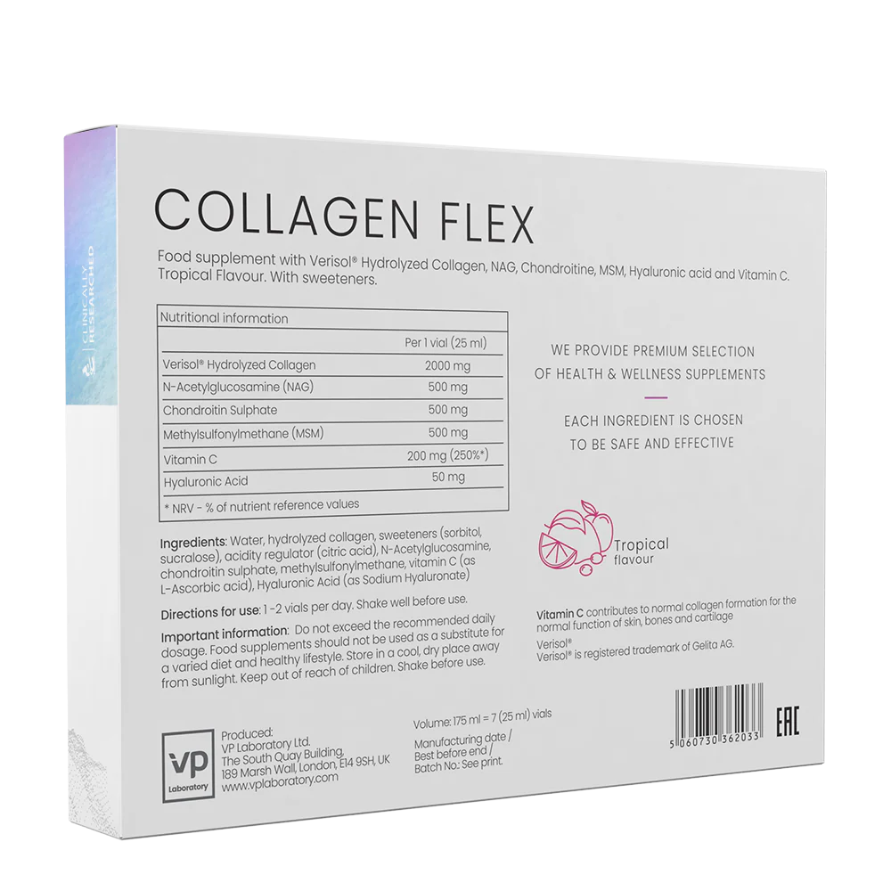 Tobulas kompleksas, specialiai sukurtas palaikyti sąnarių, kaulų ir raumenų sveikatą. Vplaboratory collagen Flex taip pat padeda kremzlių ir sausgyslių regeneracijai. Produkto sudėtyje yra kruopščiai atrinktų ir moksliškai patvirtintų sudedamųjų medžiagų: gerai biologiškai prieinamo, saugaus ir gryno Verisol® hidrolizuoto kolageno, N-acetilgliukozamino (NAG), chondroitino, didelė dozė vitamino C ir hialurono rūgšties. Hidrolizuotas kolagenas padeda plaukų, odos, nagų, sausgyslių, raiščių ir kaulų sveikatai. Jis taip pat padeda palaikyti sąnarių komfortą, mobilumą ir gyvenimo kokybę. Kolagenas yra pagrindinis kūno sąnarių struktūrinis baltymas. Jis taip pat aprūpina sveikus audinius statybinėmis medžiagomis. Šio gaminio sudėtyje yra gryno VERISOL® hidrolizuoto kolageno, hidrolizuojamo į komponentines aminorūgštis, kurias organizmas galėtų optimaliai panaudoti. N-acetilgliukozaminas yra geriausia gliukozamino forma. Natūralūs elementai N-acetilgliukozaminas ir chondroitino kompleksas yra po tyrimų parengtas maistinių medžiagų derinys su vitaminu C.