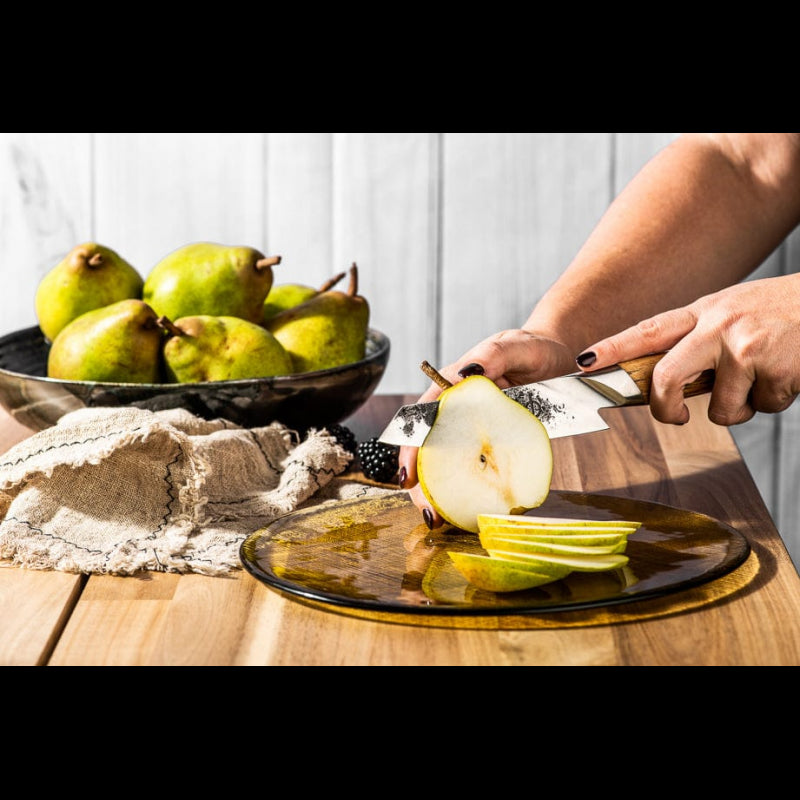 • Peilio ilgis: 14 cm, plotis: ~2 mm, 18° kampas – kompaktiškas Santoku formatas, idealiai tinkantis kapojimui, smulkinimui bei pjaustymui .