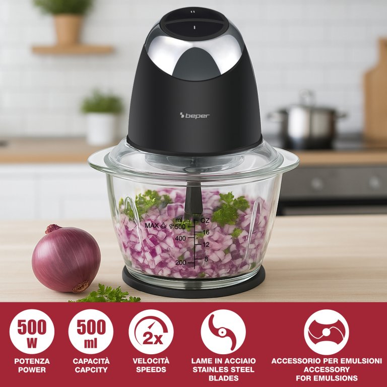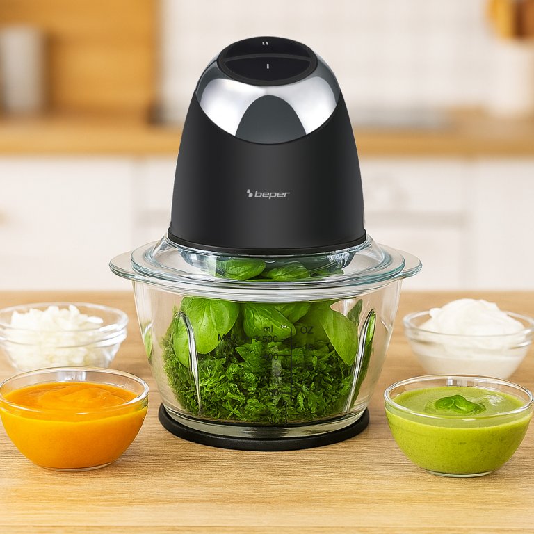 Kompaktiškas ir galingas „Beper“ smulkinimo aparatas su 500 ml stikliniu indu yra puikus pagalbininkas kasdieniams virtuvės ruošos darbams.