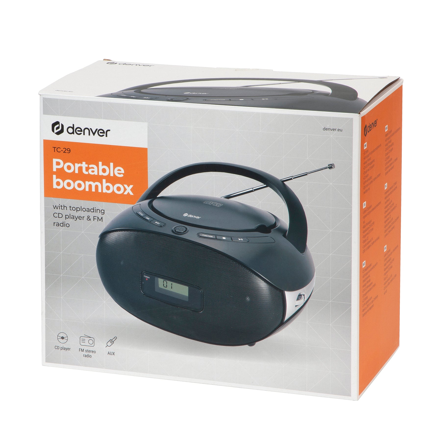 Nešiojamas boombox su iš viršaus įkeliamu CD grotuvu