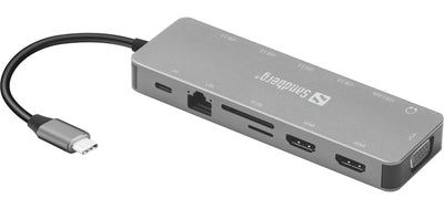 Дорожная док-станция Sandberg USB-C 13-в-1 с помощью всего лишь одного подключения USB-C к вашему ноутбуку позволяет подключить все ваше оборудование: