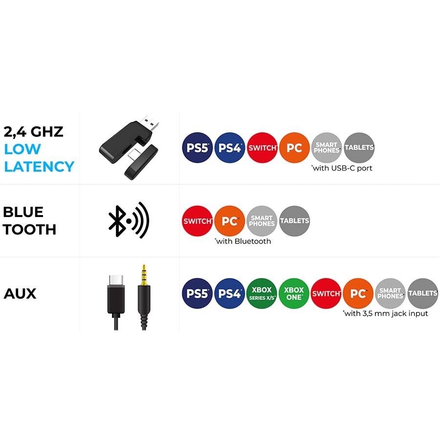 | Papildomos funkcijos | Suderinamas su PS5 / Xbox / Switch / PC / išmaniuoju telefonu |